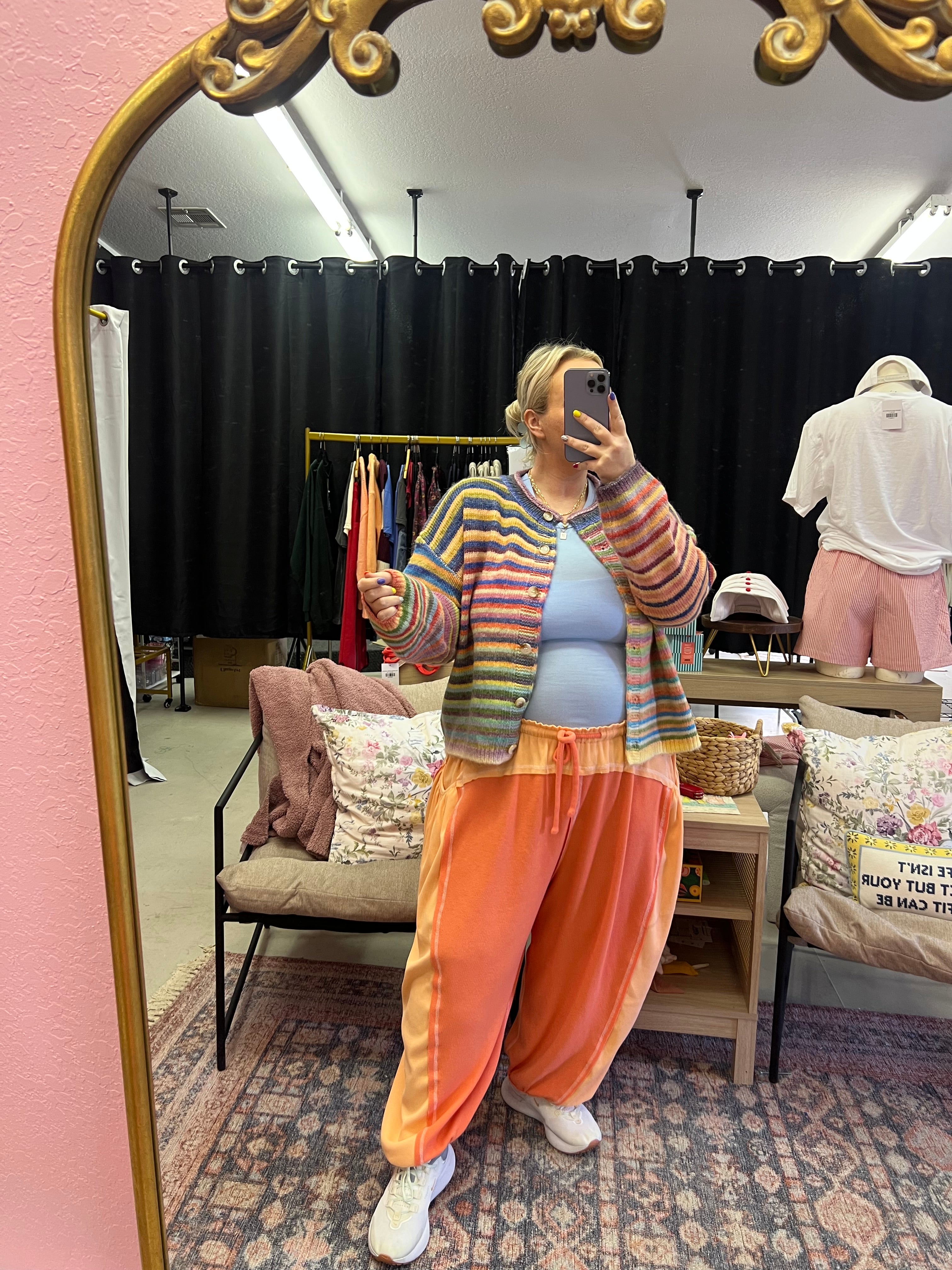 Playful knit sweater cardigan featuring vibrant rainbow buttons and a cozy, fun fit. -